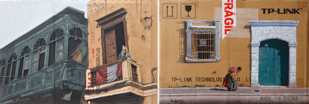 Así, Tongombol se centra en la fragilidad de la infraestructura colonial limeña, utilizando el cartón como soporte para reflejar una “arquitectura de la angustia”. “Este material no solo simboliza la precariedad de las edificaciones, sino también la vulnerabilidad social de sus habitantes”, escribe Cristias Rosas Chocano, en el texto curatorial.