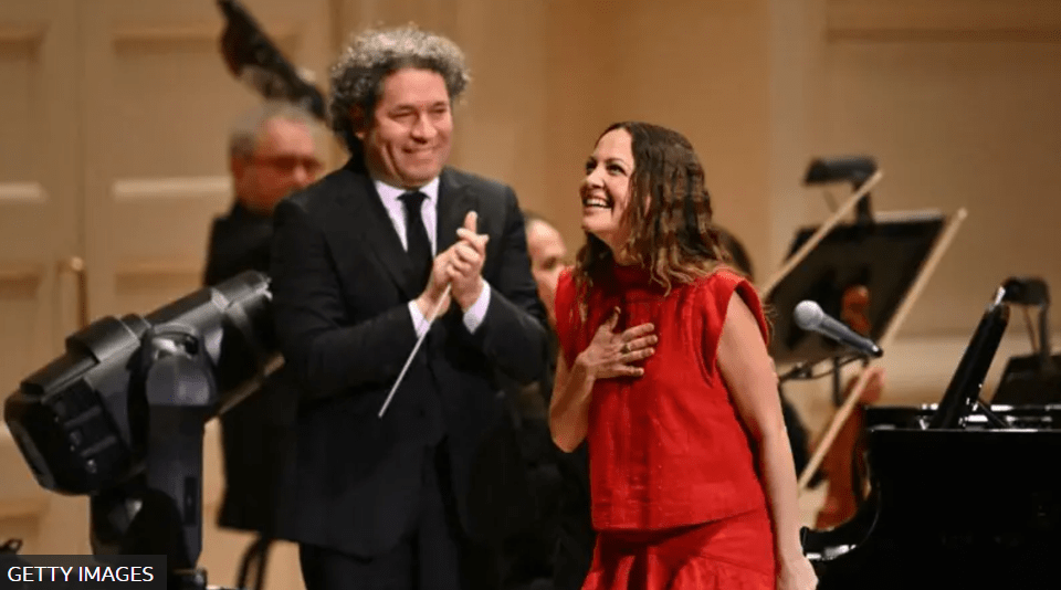 Con un traje rojo hasta los tobillos, en un marcado contraste con el uniforme negro formal de los músicos de la Filarmónica de Los Ángeles dirigida por el maestro venezolano Gustavo Dudamel, la mexicana ofreció un concierto ante una sala llena a capacidad.